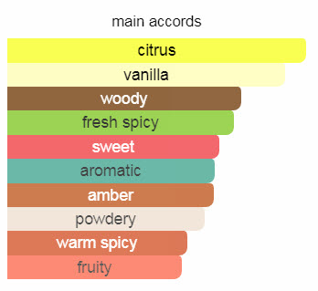 رایحه‌های اولیه‌ی آن لیمو، هلو، زنجبیل، پرتقال ماندارین، اسطوخودوس و ترنج؛ رایحه‌های میانی آن فلفل، سدر، نعناع هندی، خس خس، یاس، چوب رز برزیلی، گل رز، گاردنیا، انیسون و فریزیا؛ رایحه‌های پایه آن وانیل، دانه‌ی تونکا، چوب صندل، نارگیل، کهربا، بنزوئین، مشک، چرم و خزه‌ی بلوط هستند.