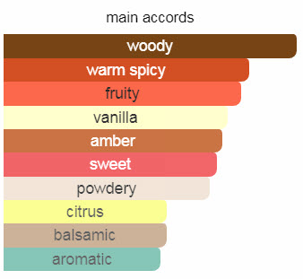 رایحه‌های اولیه آن هلو، پرتقال خونی، هل و گل آفتاب‌پرست؛ رایحه‌های میانی آن داوانا ، یاس و (Rum) و (Cognac)؛ و رایحه‌های پایه آن وانیل، برگ نعناع هندی اندونزیایی، دانه تونکا، چوب صندل، بنزوئین، کشمیر، استیراکس، لابدانوم و خس خس است.
