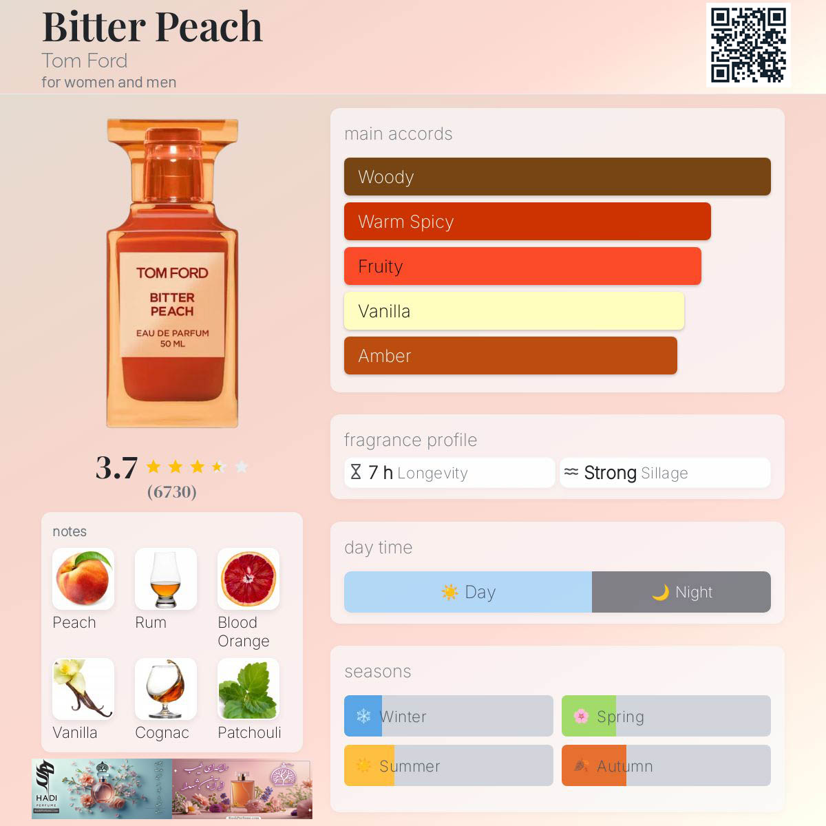 بیتر پیچ Tom Ford Bitter Peach عطری جذاب، میوه‌ای-شرقی و لوکس است که با محوریت هلو و پرتقال خونی شروع می‌شود و به نت‌های چوبی و وانیلی می‌رسد. مناسب کسانی است که دنبال عطری خاص، گرم و ترکیبی از میوه و عمق برای بهار تا پاییز (شب‌ها یا موقعیت‌های خاص) هستند.