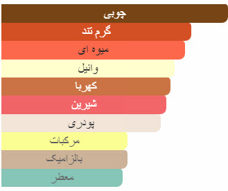 🌲 چوب صندل، 🌿 نعناع هندی (Patchouli)، 🍬 وانیل، 🍫 دانه تونکا، 🟤 بنزوئین، 🪵 کشمران، لب‌دانوم، خس‌خس
