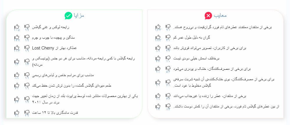 تام فورد چری اسموک: «سیگار گیلاس»، یک لذت‌ و تجربه‌‌ای که گویی با آتش بازی می‌کند و با رایحه گیلاس تیره، که با اسمانتوس اغواکننده و چوب‌های دودیِ در حال سوختن مشتعل شده است، می‌درخشد. عطر چری اسموک به عنوان عطری گرم و تند طبقه‌بندی می‌شود. چری اسموک با رایحه نفیس طعم گیلاس تیره آغاز می‌شود که با نت‌های زعفرانی عجیب و غریبی تقویت شده است. گل‌های سفید معطر اسمانتوس، رایحه‌‌ای از زردآلو، زیتون و چرم را از خود ساطع می‌کنند؛ در حالی که آکورد چوب دودی گرانبها با شور و نشاطی گرم و کششی سوزان و جوشان، وسوسه‌انگیز است.