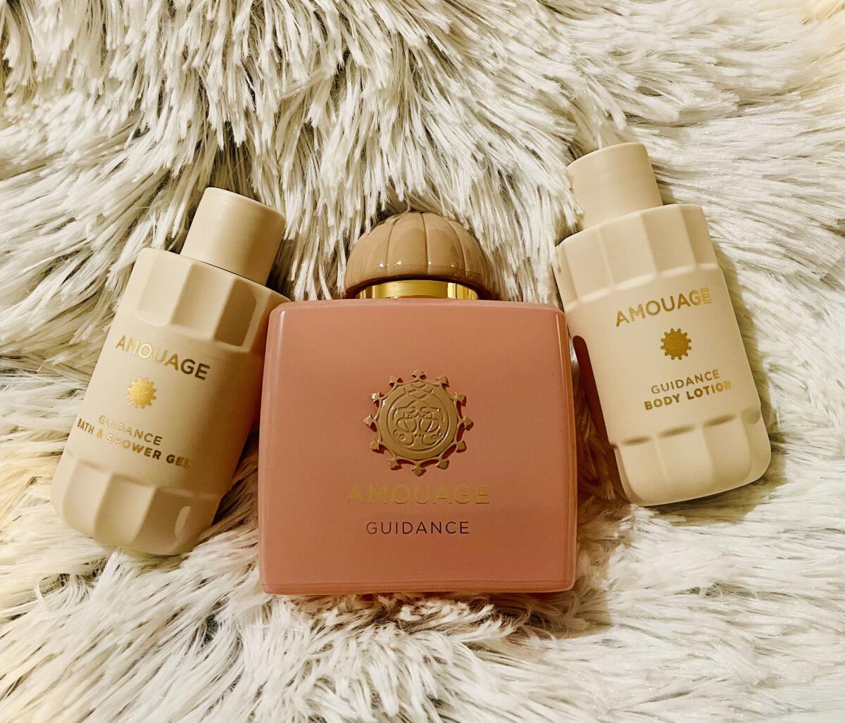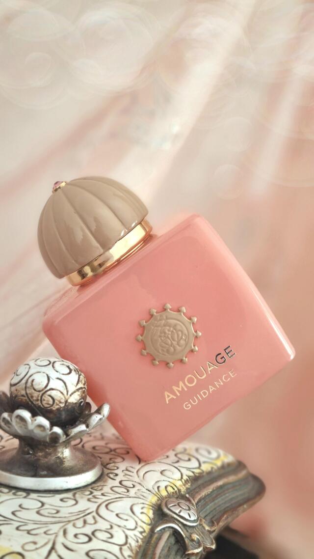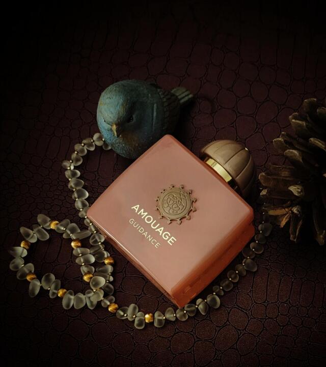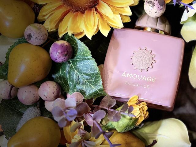 گایدنس Guidance از برند آمواژ Amouge، عطری با رایحه گلی-میوه ای برای زنان و مردان است. نتهای اولیه آن گلابی، فندق و کندر هستند؛ نتهای میانی آن اسمانتوس(Osmanthus از تیره زیتون)، گل رز، زعفران و یاس سامباک؛ و نتهای پایه آن چوب صندل، وانیل، چوب آکیگالا، عنبر سائل و لابدانوم هستند.