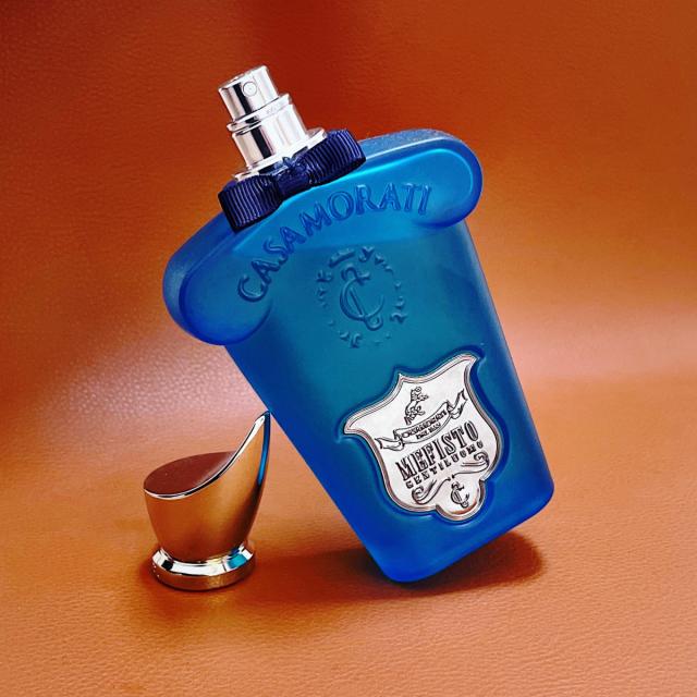 بستهبندی و طراحی بطری مفیستو نیز هماهنگ با روح سنتی آن است. شیشه عطر مفیستو با طراحی کلاسیک، رنگ آبی سلطنتی و درپوش طلاییرنگ، انگار از روی میز آرایش یک نجیبزاده قرن نوزدهم برداشته شده است. تمام جزئیات مفیستو کازاموراتی، از فونت نامگرفته تا نشان تاجمانند بالای شیشه، در جهت تداعی همان فضای اشرافی طراحی شدهاند.